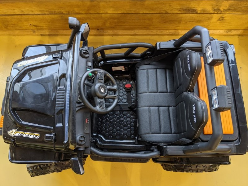 Le véhicule est muni d’une grosse batterie amovible et facile d’accès de 12v 10 Ah ainsi que 4 puissants moteurs de 45w chaque. Il n’y a pas de limites pour votre enfant avec les 4 moteurs et les quatre vitesses que possèdent celui-ci. De plus, les amortisseurs sur les quatre roues offrent une suspension fiable et douce au côte à côte.
